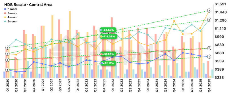 On top of that, HDB resale prices in the Central Area have grown across all flat types since 2020. 4-room flats are in the lead, more than doubling in value with a 116% jump. 5- and 3-room flats are neck and neck, with a 64% and 62% growth respectively. Whereas 2-room units gained around 38%.