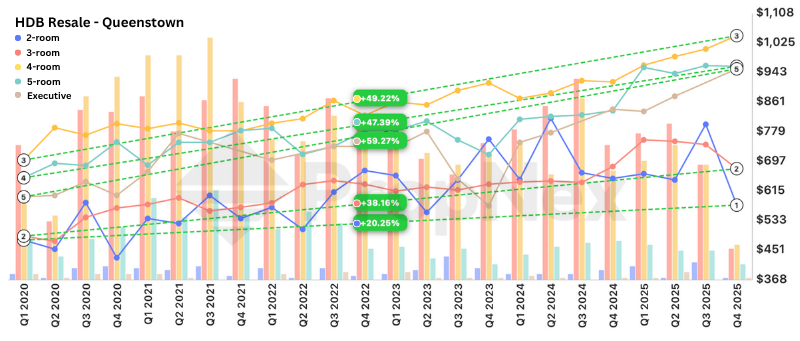 And 155 more homes crossed the million-dollar mark, out of 601 resale transactions in the past year. Prices here have also climbed steadily since 2020. Executive flats lead the growth at 59%, thanks to its exclusivity. Following that are 4-room units at 49% and 5-room at 47%. 3-room flats saw a strong 38% rise, while 2-room units grew about 20%.