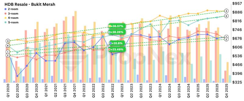 Though the numbers aren't as dramatic as Central Area's and Queenstown's, it's worth remembering that Bukit Merah isn't nearly as scarce. Even so, demand here runs deep across all segments, which is a sign of how the estate continues to draw buyers who want city-fringe convenience without paying full-on city prices.