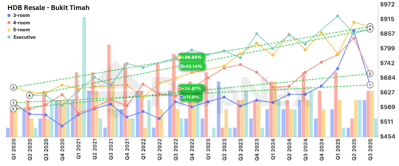 There were no 2-room resale transactions at all, which isn't surprising given how few exist in the first place. Buyers here tend to prioritise space and privacy, so the larger flat types naturally attract more interest. Besides, HDB living isn't the first thing people associate with Bukit Timah since this town is synonymous with luxury homes, prestigious schools, and nature reserves.